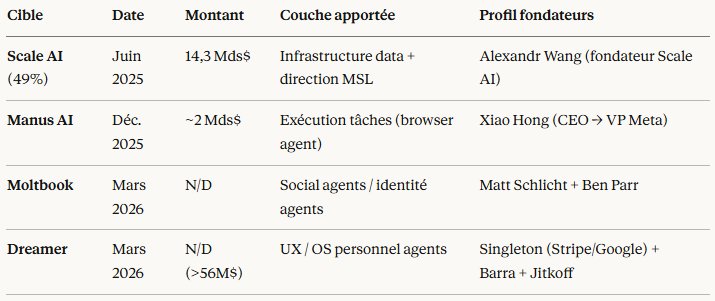 - L'acqui-hire de Dreamer (David Singleton ex-Stripe/Google, Hugo Barra ex-Google/Meta, Nicholas Jitkoff ex-Chrome OS) est le troisième mouvement d'assemblage de Meta Superintelligence Labs en quatre mois, après Manus (2 Mds$) et Moltbook, ciblant trois couches distinctes d'une architecture agents IA grand public : exécution, identité sociale, et UX personnalisée.