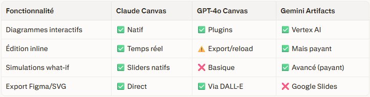 Avantage concurrentiel Anthropic. Contrairement à ChatGPT (plugins externes) ou Gemini (Vertex AI payant), Canvas est natif, gratuit (Pro users) et agentique : Claude planifie/iterate sans quitter le chat. Parfait pour étudiants, PMEs, consultants – 80% des tâches knowledge-work passent par des visuels.