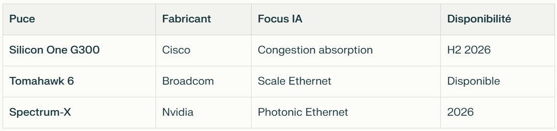 Perspectives : Succès G300 = Cisco reconverti AI infra player ; échec = marginalisation vs pure players. Signal fort : Réseau = nouveau战场 silicium IA