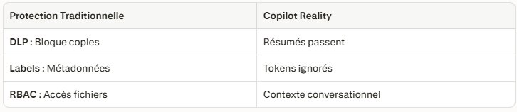 - Opacité Modèle : GPT sous-jacent ne "comprend" pas métadonnées DLP (labels = texte, pas sémantique).