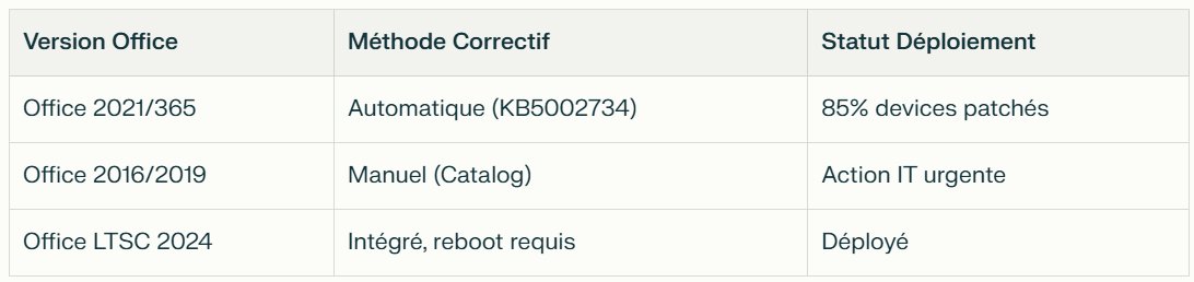 - Office 2021/365 : Mise à jour automatique via Microsoft Update (KB5002734), appliquée silently sur devices gérés Intune/Autopatch.