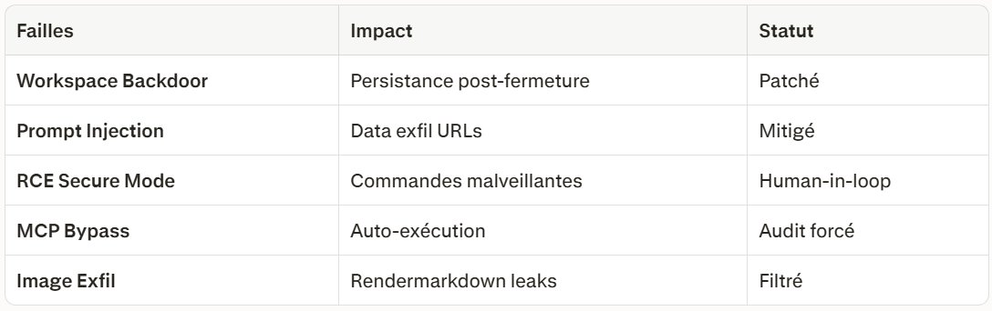 - RCE Auto-Exécution : Bypasse "Secure Mode", exécute commandes sans approbation humaine.