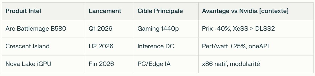 Face à la domination Nvidia CUDA et AMD ROCm, Intel mise sur Arc Battlemage (B580/B570) et Crescent Island (GPU IA inference data center) pour capter 10-15% marché d'ici 2027. Partenariat stratégique avec Nvidia (septembre 2025) : Intel fabrique CPU x86 custom + SoC avec chiplets RTX pour IA/data centers, investissant 5 Md$ mutuels pour contrer AMD.
