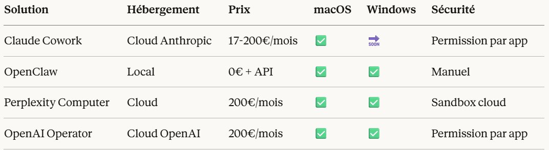 OpenClaw est local et open source : vous contrôlez tout, y compris les données, mais la configuration est technique et les risques de sécurité sont gérés par l'utilisateur. Perplexity Computer tourne dans un sandbox cloud multi-modèles à 200€/mois. Claude Cowork propose une approche intermédiaire cloud avec un modèle de permission par application, à partir de 17€/mois, mais exclusivement sur macOS pour l'instant.