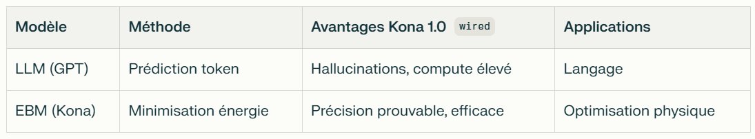Logical Intelligence, basée à San Francisco, a nommé Yann LeCun au 21 janvier 2026 comme président fondateur de son conseil technique de recherche ; l'entreprise a lancé Kona 1.0, premier EBM fonctionnel, résolvant des sudokus plus vite que GPT-5 ou Claude sur un seul GPU H100 Nvidia. Fondée par Eve Bodnia (CEO), elle cible des secteurs critiques nécessitant certitude mathématique : fabrication avancée, énergie, semi-conducteurs et robotique.