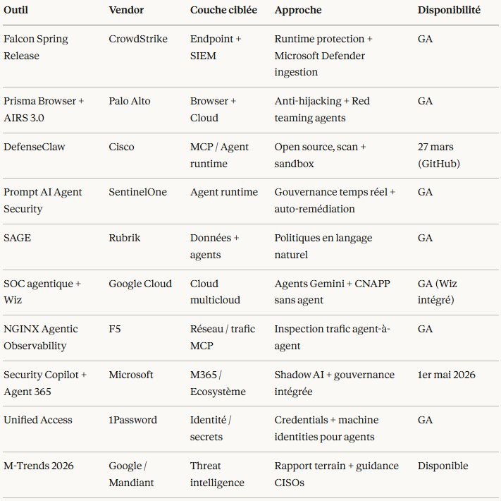 - CrowdStrike, Palo Alto, Cisco, SentinelOne, Rubrik et Google ont tous lancé des outils spécifiques pour gouverner, surveiller et sécuriser les agents IA autonomes en production, signalant l'émergence d'une nouvelle catégorie à part entière : l'AI Security.