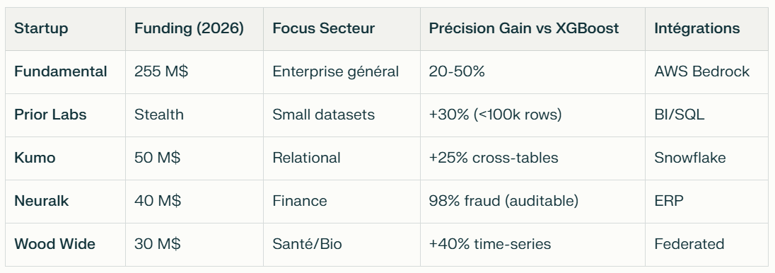 Au-delà de Fundamental (255 M$ levés, NEXUS LTM), un écosystème de startups spécialisées LTMs (Large Tabular Models) émerge pour exploiter les 10-20% données structurées (tables/spreadsheets) d'entreprises, TAM 29 Md$ 2028 (Gartner). Ces acteurs surpassent ML traditionnel (XGBoost) et LLMs sur précision/prévision low-data, ciblant finance/retail/santé.