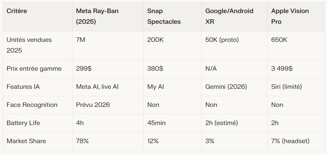Tableau : Comparatif Meta Smart Glasses vs Concurrence