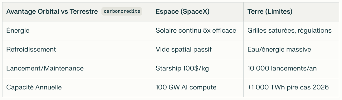 SpaceX demande FCC autorisation 1 million sats solaires (100 GW compute/an, 100 kW/tonne) via Starship (10 000 lancements/an, 1/heure), panneaux solaires spatiaux 5x efficaces (sans nuit/nuages/verre), refroidissement passif vide spatial, lasers inter-sats > fibre optique. Test Starcloud (GPU Nvidia orbital) novembre 2025 réussi ; Musk : « Hyper-hyper hyperscaler », > AI terrestre cumulée.