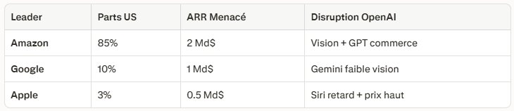Amazon : Alexa pivot GPT licensing ou déclin. Apple : Home Hub urgence, Siri GPT-powered ? Samsung/LG : OpenAI OS licensing smart TVs. Sonos : Partenariat survie.