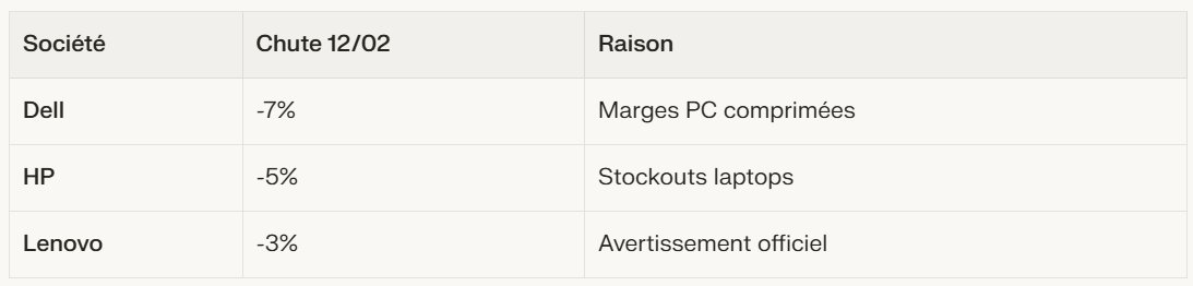 Mars 2025 : SK Hynix vend **tout stock HBM 2026** ; prix +46 % (DRAM/NAND). Déc. 2025 : Lenovo/HP réservent RAM chez Samsung/SK/Micron (stock sécurisé). Jan. 2026 : Samsung : "Pénurie inédite, hausse prix PC inévitable" [web:566]. Fév. 2026 : Lenovo : "Pression expéditions ; prix up, pivot IA inference" [web:568].
