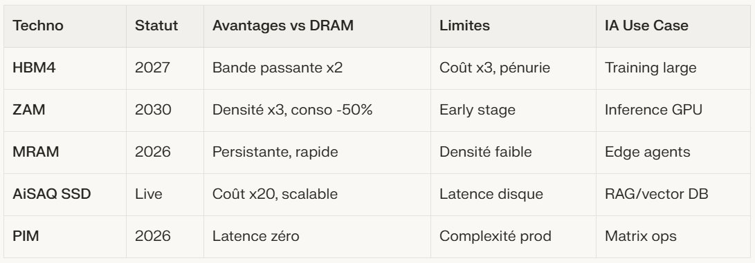 La pénurie mondiale de DRAM/HBM confirmée par Lenovo/Samsung pousse l'industrie IA vers des alternatives optimisant bande passante, densité et consommation, tout en contournant les goulets physiques actuels. Ces technologies (ZAM, 3D DRAM, MRAM, SSD vectoriels) visent à remplacer/suppléer HBM dans training/inference à grande échelle.