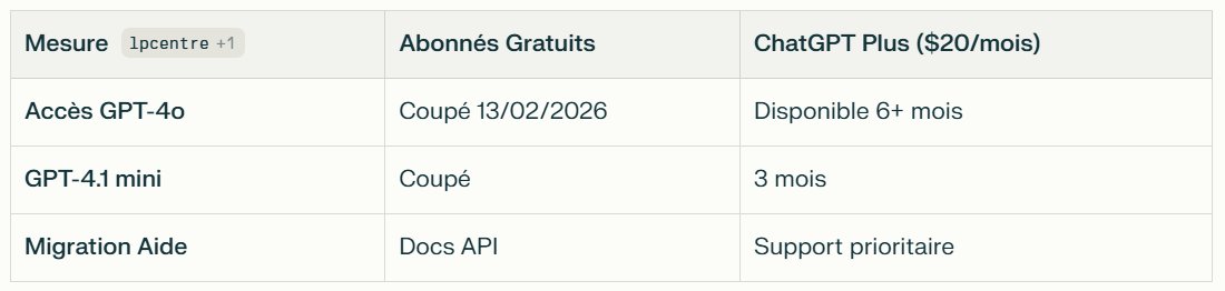 OpenAI retire GPT-4o, GPT-4.1, GPT-4.1 mini et o4-mini des APIs ChatGPT au 13 février 2026, après un premier report forcé en août 2025 suite au "4o-pocalypse". Officiellement, usage faible (5% vs GPT-5.1/5.2) et coûts maintenance justifient ; GPT-5 offre raisonnement supérieur, latence réduite.