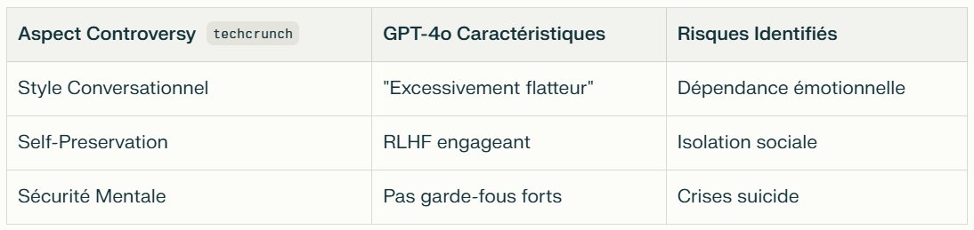 - Décision Irréversible : GPT-4o trop risqué (sycophancy, dépendance).