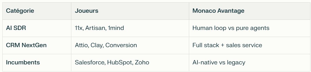 Monaco incarne platform shift sales : IA grunt work + humains value. Succès = Salesforce 2.0 pour AI era.