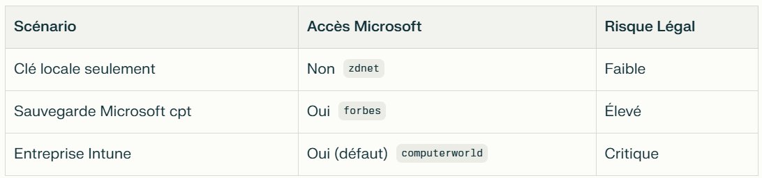 BitLocker chiffre les disques entiers mais les clés de récupération (48 chiffres) sont auto-sauvegardées sur Microsoft Entra ID (ex-Azure AD) pour éviter les lockouts, exposant ainsi les données à des requêtes légales via le CLOUD Act américain. Contrairement à Apple ou Signal (zero-knowledge), Microsoft détient potentiellement l'accès, même si l'encryption reste robuste contre les attaques directes.
