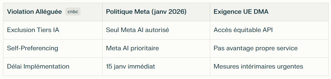 Meta : « Allégations infondées ; surcharge bots tiers insoutenable ; IA concurrentielle via apps/OS/partenariats » ; enquête DMA lancée décembre 2025 suit plaintes startups. Parallèle Italie : enquête juillet 2025 sur abus dominance Meta AI.