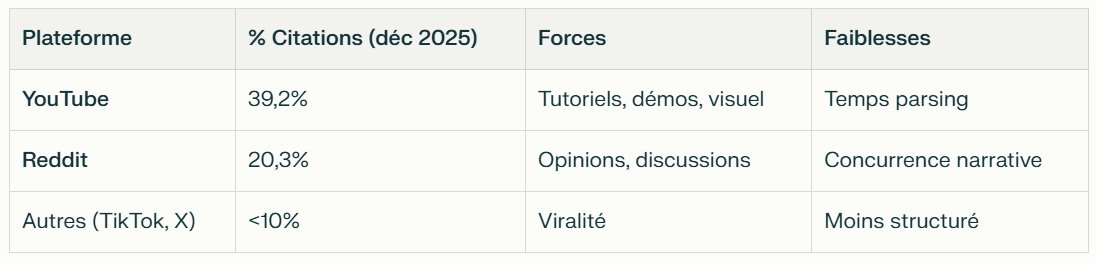 D’après Adweek (25/01/2026), YouTube représente désormais 16% des citations sociales dans les réponses LLM sur les 6 derniers mois, contre 10% pour Reddit.